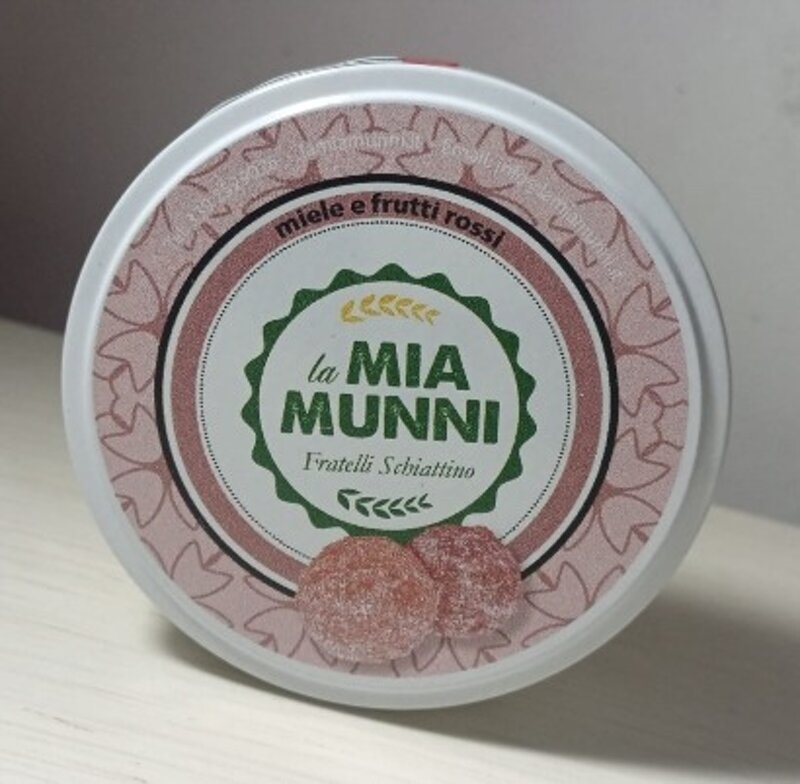 Ingredienti: zucchero,sciroppo di glucosio,miele 10%,succo di mirtillo 1%,aroma di mirtillo rosso,aroma di melograno,correttore di acidità,acido citrico,agente di rivestimento,cera carnauba,aromi.